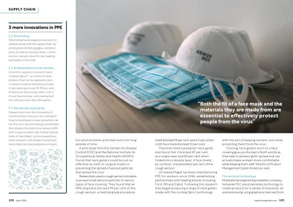 1 | 3D printing 3D printing has emerged as a solution to address issues with the supply chain , by printing face shields , goggles , ventilator parts as well as testing swabs . Check out our January issue for two leading examples in this field .