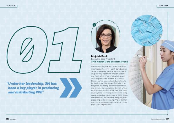 Iranian-born Mojdeh Poul is the Executive Vice President of 3M ’ s Health Care Business Group , overseeing medical and oral health , drug delivery , health information systems and food safety . Poul originally trained as an engineer and worked at General Electric before leaving the industrial world for healthcare . She joined 3M in 2011 as the global marketing leader for the critical and chronic care solutions division of the Health Care Business Group . She then held several global leadership roles before being appointed to her current role in 2019 . Under her leadership , 3M has been a key player in producing and distributing PPE and other medical supplies around the world during the COVID-19 pandemic . healthcareglobal . com 137