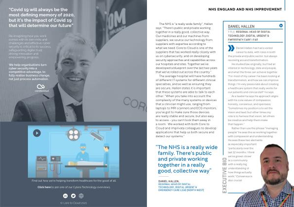 We help organisations turn cyber security into a competitive advantage , to fully realise business change , not just process automation . Find out how we ’ re helping transform healthcare for the good of all . Click here to join one of our Cylera Technology overviews . 142 April 2021