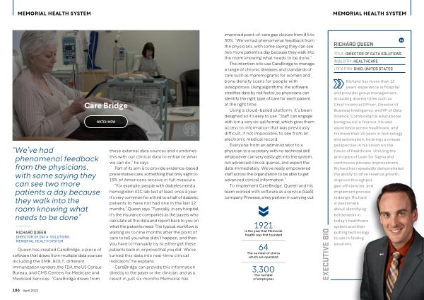 “ For example , people with diabetes need a hemoglobin A1C lab test at least once a year . It ’ s very common for a third to a half of diabetic patients to have not had one in the last 12 months ,” Queen says . “ Typically , in any hospital , it ’ s the insurance companies as the payers who calculate all this data and report back to you on what the patients need . The typical workflow is waiting six to nine months after the point of care to tell you what didn ’ t happen , and then you have to manually try to either get these patients back in , or prove that you did . We ’ ve turned this data into real-time clinical indicators ” he explains .