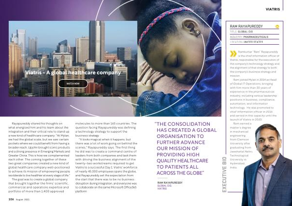" It looks magical when it happens , but there was a lot of work going on behind the scenes ," Rayapureddy says . The first thing he did was to create a command centre of leaders from both companies and task them with driving the business alignment of the twenty-two workstreams required to get Viatris to a successful Day 1 . Viatris ’ workforce of nearly 45,000 employees spans the globe , and Rayapureddy set the expectation from the start that there was to be no business disruption during integration , and everyone was to collaborate on the same Microsoft Office365 platform .