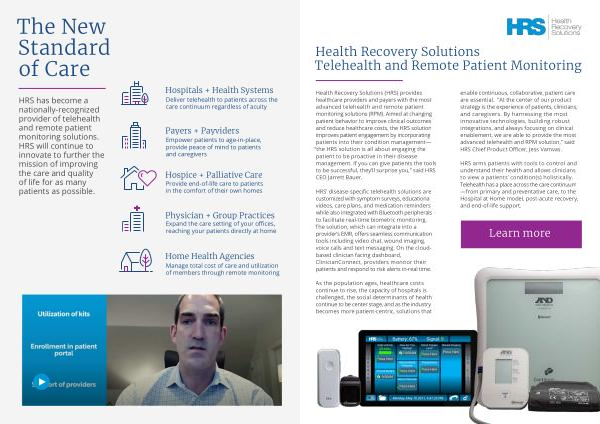 HRS has become a nationally-recognized provider of telehealth and remote patient monitoring solutions . HRS will continue to innovate to further the mission of improving the care and quality of life for as many patients as possible .