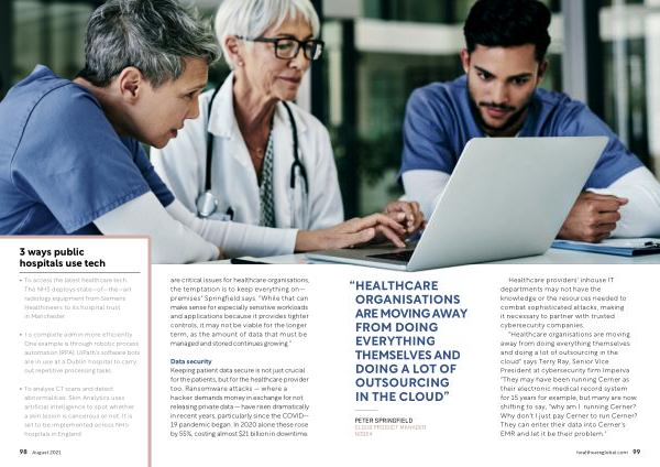 • To analyse CT scans and detect abnormalities . Skin Analytics uses artificial intelligence to spot whether a skin lesion is cancerous or not . It is set to be implemented across NHS hospitals in England are critical issues for healthcare organisations , the temptation is to keep everything on — premises " Springfield says . " While that can make sense for especially sensitive workloads and applications because it provides tighter controls , it may not be viable for the longer term , as the amount of data that must be managed and stored continues growing ."