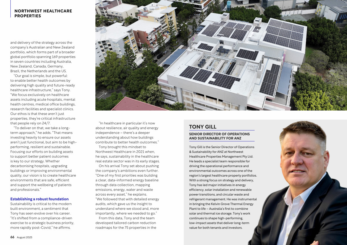 Tony Gill is the Senior Director of Operations & Sustainability for ANZ at Northwest Healthcare Properties Management Pty Ltd. He leads a specialist team responsible for driving the operational performance and environmental outcomes across one of the region’ s largest healthcare property portfolios. With a strong focus on strategy and delivery, Tony has led major initiatives in energy efficiency, solar installation and renewable power transitions, and circular waste and refrigerant management. He was instrumental in bringing the Kelvin Grove Thermal Energy Plant to life – Australia’ s first to combine solar and thermal ice storage. Tony’ s work continues to shape high-performing, low-impact assets that deliver long-term value for both tenants and investors.