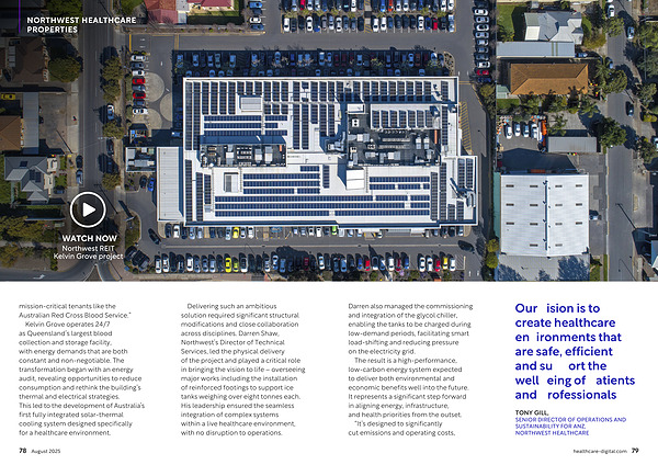 Kelvin Grove operates 24 / 7 as Queensland’ s largest blood collection and storage facility, with energy demands that are both constant and non-negotiable. The transformation began with an energy audit, revealing opportunities to reduce consumption and rethink the building’ s thermal and electrical strategies. This led to the development of Australia’ s first fully integrated solar-thermal cooling system designed specifically for a healthcare environment.