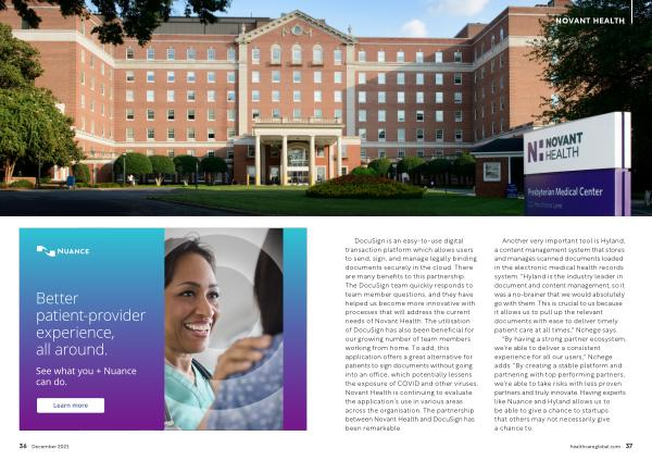 DocuSign is an easy-to-use digital transaction platform which allows users to send , sign , and manage legally binding documents securely in the cloud . There are many benefits to this partnership . The DocuSign team quickly responds to team member questions , and they have helped us become more innovative with processes that will address the current needs of Novant Health . The utilisation of DocuSign has also been beneficial for our growing number of team members working from home . To add , this application offers a great alternative for patients to sign documents without going into an office , which potentially lessens the exposure of COVID and other viruses . Novant Health is continuing to evaluate the application ’ s use in various areas across the organisation . The partnership between Novant Health and DocuSign has been remarkable .