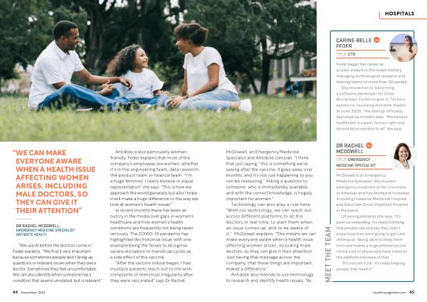 Antidote is also particularly womenfriendly . Feder explains that most of the company ' s employees are women , whether it ' s in the engineering team , data research , the product team or finance team . " I ' m a huge feminist . I really believe in equal representation " she says . " This is how we approach the world generally but also I hope it will make a huge difference to the way we look at women ' s health issues ."