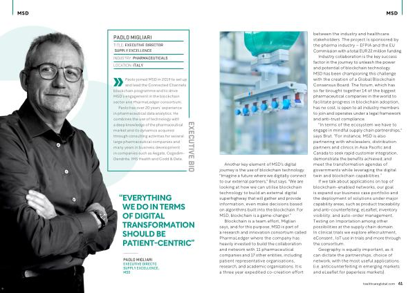 Paolo joined MSD in 2019 to set up and lead the Connected Channels blockchain programme and to drive MSD ’ s engagement in the blockchain sector and PharmaLedger consortium .