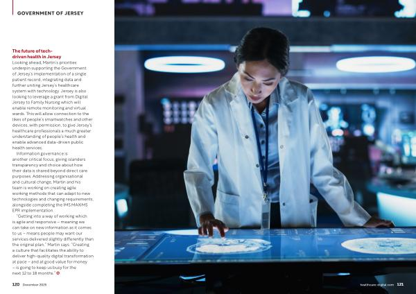 The future of techdriven health in Jersey Looking ahead, Martin’ s priorities underpin supporting the Government of Jersey’ s implementation of a single patient record, integrating data and further uniting Jersey’ s healthcare system with technology. Jersey is also looking to leverage a grant from Digital Jersey to Family Nursing which will enable remote monitoring and virtual wards. This will allow connection to the likes of people’ s smartwatches and other devices, with permission, to give Jersey’ s healthcare professionals a much greater understanding of people’ s health and enable advanced data-driven public health services.