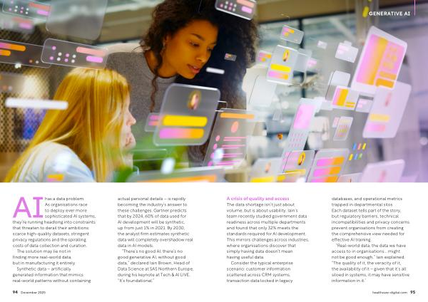 “ Real-world data, the data we have access to in organisations... might not be good enough,” Iain explained.“ The quality of it, the veracity of it, the availability of it – given that it’ s all siloed in systems, it may have sensitive information in it.” healthcare-digital. com 95