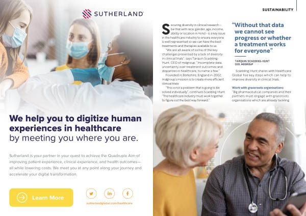 Sutherland is your partner in your quest to achieve the Quadruple Aim of improving patient experience , clinical experience , and health outcomes — all while lowering costs . We meet you at any point along your journey and accelerate your digital transformation .