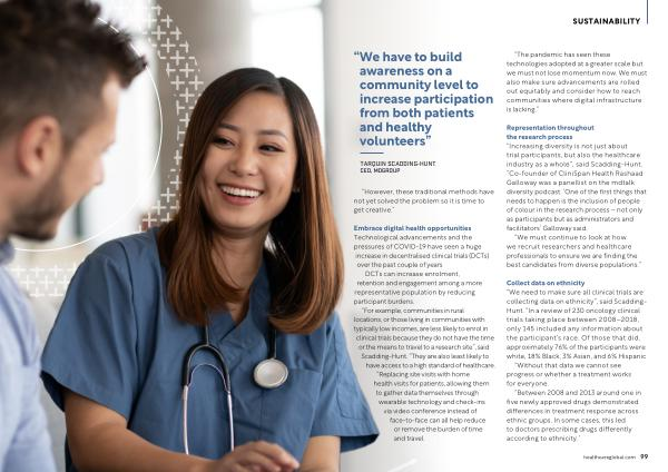 Representation throughout the research process “ Increasing diversity is not just about trial participants , but also the healthcare industry as a whole ”, said Scadding-Hunt . “ Co-founder of CliniSpan Health Rashaad Galloway was a panellist on the mdtalk diversity podcast . ‘ One of the first things that needs to happen is the inclusion of people of colour in the research process – not only as participants but as administrators and facilitators ’ Galloway said .