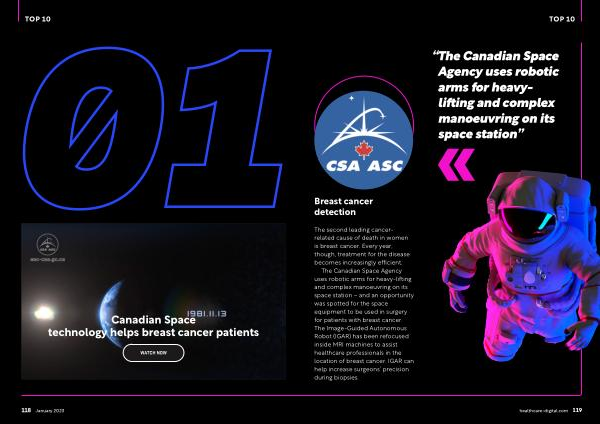 The Canadian Space Agency uses robotic arms for heavy-lifting and complex manoeuvring on its space station – and an opportunity was spotted for the space equipment to be used in surgery for patients with breast cancer . The Image-Guided Autonomous Robot ( IGAR ) has been refocused inside MRI machines to assist healthcare professionals in the location of breast cancer . IGAR can help increase surgeons ’ precision during biopsies . healthcare-digital . com 119