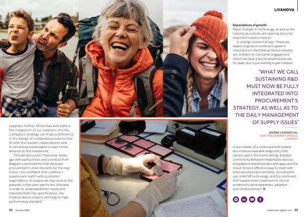 “ The last discussion I had some weeks ago with perfusionists and scientists from Belgium convinced me that these are procurement ´ s main missions for the near future . I am confident that LivaNova ´ s pipeline will match with customers ’ expectations . As long as we stay close to the patients , to the users and to the clinicians in order to understand their needs and translate them into specifications , the medical device industry will keep its highperformance standard .”