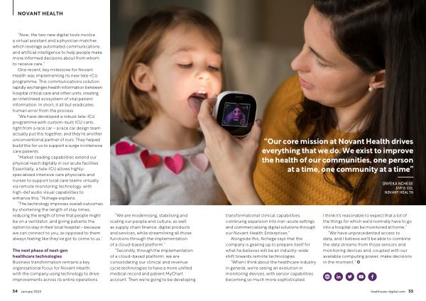 “ Market-leading capabilities extend our physical reach digitally in our acute facilities . Essentially , a tele-ICU allows highlyspecialised intensive care physicians and nurses to support local care teams virtually via remote monitoring technology , with high-def audio visual capabilities to enhance this ,” Nchege explains .
