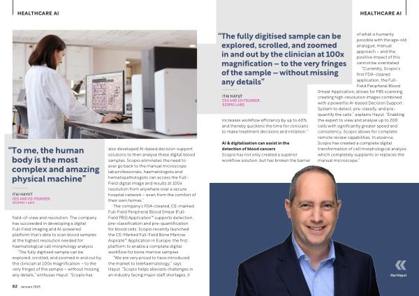 “ The fully digitised sample can be explored , scrolled , and zoomed in and out by the clinician at 100x magnification – to the very fringes of the sample – without missing any details ,” enthuses Hayut . “ Scopio has also developed AI-based decision-support solutions to then analyse these digital blood samples . Scopio eliminates the need to ever go back to the manual microscope : lab professionals , haematologists and hematopathologists can access the Full- Field digital image and results at 100x resolution from anywhere over a secure hospital network – even from the comfort of their own homes .”