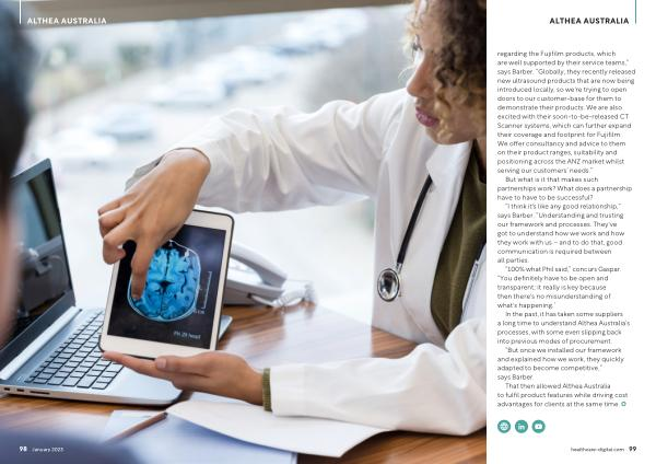 regarding the Fujifilm products , which are well supported by their service teams ,” says Barber . “ Globally , they recently released new ultrasound products that are now being introduced locally , so we ' re trying to open doors to our customer-base for them to demonstrate their products . We are also excited with their soon-to-be-released CT Scanner systems , which can further expand their coverage and footprint for Fujifilm . We offer consultancy and advice to them on their product ranges , suitability and positioning across the ANZ market whilst serving our customers ’ needs .”