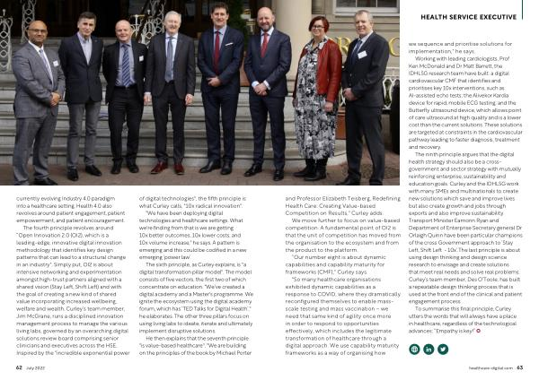 The ninth principle argues that the digital health strategy should also be a crossgovernment and sector strategy with mutually reinforcing enterprise , sustainability and education goals . Curley and the IDHLSG work with many SMEs and multinationals to create new solutions which save and improve lives but also create growth and jobs through exports and also improve sustainability . Transport Minister Eamonn Ryan and Department of Enterprise Secretary general Dr Orlaigh Quinn have been particular champions of the cross Government approach to ‘ Stay Left , Shift Left - 10x ’. The last principle is about using design thinking and design science research to envisage and create solutions that meet real needs and solve real problems . Curley ’ s team member , Des O ’ Toole , has built a repeatable design thinking process that is used at the front end of the clinical and patient engagement process .