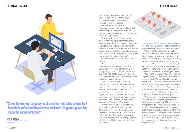 At the MultiCare Behavioural Health Network , Clark says it ’ s now looking at how it can “ ensure behavioural health access and behavioural health presence not just in primary care and paediatrics family medicine , but also across different service lines that maybe we didn ' t fully appreciate , where behavioural health was occurring before the pandemic ”. But what about the future of digital health ? “ It ' s going to keep growing and we ' re going to get better at it – and keep it sustainable ,” predicts Clark . “ Partnerships like this will hopefully become more common , because as we ' ve made it through as a healthcare system and certainly developed lots of great strengths in virtual services , we can learn , develop and grow more quickly by leaning on other organisations ' expertise and strengths .”