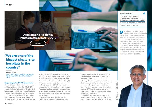 Clinical Information Officer ( CCIO ) and consultant in clinical neurology at University Hospital Southampton NHS FT . Dr Pinto graduated from the first cohort of the NHS Digital Academy in 2019 and was appointed joint CCIO shortly after . Key digital interests include clinical data integration between primary and secondary care and the development of untethered personal health records ( PHRs ). organisations around the world transition to remote working where possible , was Microsoft Teams .