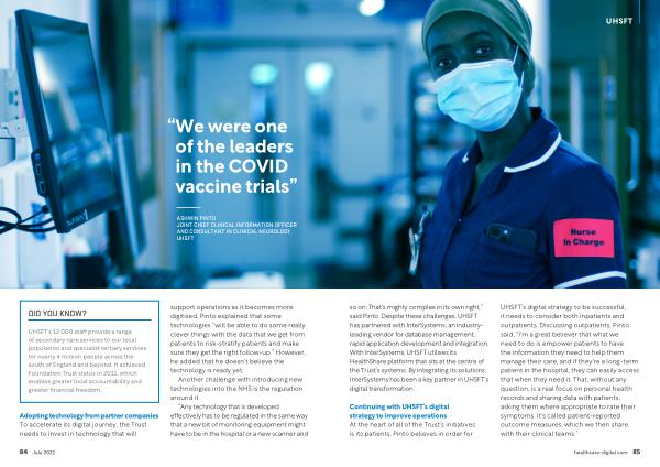 UHSFT so on . That ' s mighty complex in its own right ,” said Pinto . Despite these challenges , UHSFT has partnered with InterSystems , an industryleading vendor for database management , rapid application development and integration . With InterSystems , UHSFT utilises its HealthShare platform that sits at the centre of the Trust ’ s systems . By integrating its solutions , InterSystems has been a key partner in UHSFT ’ s digital transformation .