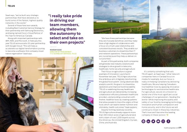 Their focus on agriculture is a great example of innovation . Launched in November last year , TELUS Agriculture has the ambitious aim of digitally transforming the global food system . Using advanced data analytics and AI , the goal is to streamline operations and improve food traceability . " TELUS is redefining the way healthcare and agriculture are delivered by increasing collaboration efficiency between healthcare providers , and providing consumers with fresher , healthier food , by creating systems that allow people to trace the origins of their food , which can lead to better nutrition and ultimately , health outcomes " Saad explains .