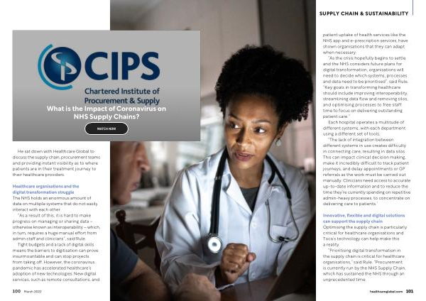 “ Prioritising digital transformation in the supply chain is critical for healthcare organisations ,” said Rule . “ Procurement is currently run by the NHS Supply Chain , which has sustained the NHS through an unprecedented time . healthcareglobal . com 101