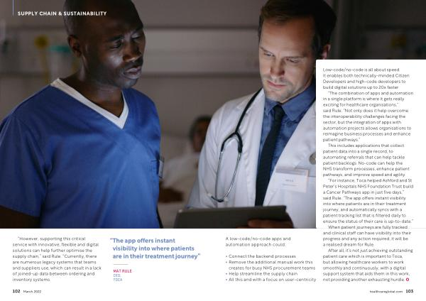 “ For instance , Toca helped Ashford and St Peter ’ s Hospitals NHS Foundation Trust build a Cancer Pathways app in just five days ,” said Rule . “ The app offers instant visibility into where patients are in their treatment journey , and automatically syncs with a patient tracking list that is filtered daily to ensure the status of their care is up-to-date .” When patient journeys are fully tracked and clinical staff can have visibility into their progress and any action required , it will be a realised dream for Rule .
