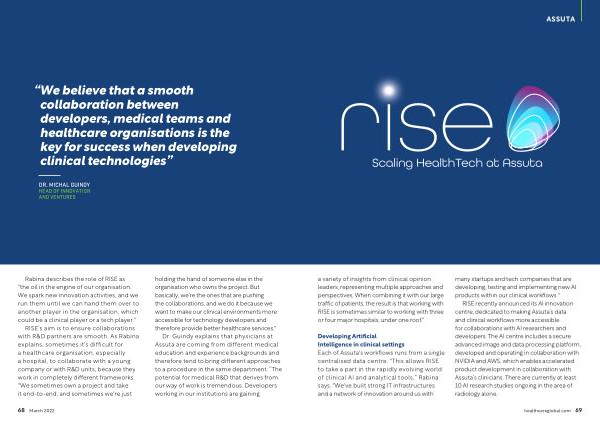 RISE ’ s aim is to ensure collaborations with R & D partners are smooth . As Rabina explains , sometimes it ' s difficult for a healthcare organisation , especially a hospital , to collaborate with a young company or with R & D units , because they work in completely different frameworks . " We sometimes own a project and take it end-to-end , and sometimes we ' re just holding the hand of someone else in the organisation who owns the project . But basically , we ' re the ones that are pushing the collaborations , and we do it because we want to make our clinical environments more accessible for technology developers and therefore provide better healthcare services ."