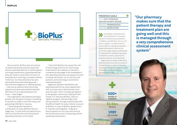Vice President of IT , ensures that the IT infrastructure at BioPlus is reliable , cost effective , secure , and easy to support . His department is responsible for making sure patient health information is secure and protected . Gagle deeply understands IT ’ s potential for making things easier for patients , doctors , pharmacists , business partners , and employees .