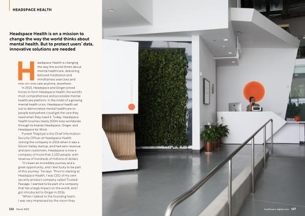 Puneet Thapliyal is the Chief Information Security Officer at Headspace Health . Joining the company in 2016 when it was a Silicon Valley startup , and had zero revenue and zero customers , Headspace is now a company of more than 1,100 people , with revenue of hundreds of millions of dollars . “ It ' s been an incredible journey and a great opportunity , and I feel lucky to be part of this journey ,” he says . “ Prior to starting at Headspace Health , I was CEO of my own security product company called Trusted Passage . I wanted to be part of a company that has a large impact on the world , and I got introduced to Ginger in 2016 .