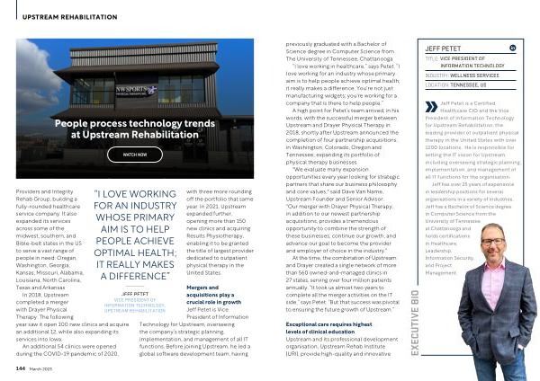 JEFF PETET VICE PRESIDENT OF INFORMATION TECHNOLOGY , UPSTREAM REHABILITATION with three more rounding off the portfolio that same year . In 2021 , Upstream expanded further , opening more than 150 new clinics and acquiring Results Physiotherapy , enabling it to be granted the title of largest provider dedicated to outpatient physical therapy in the United States .