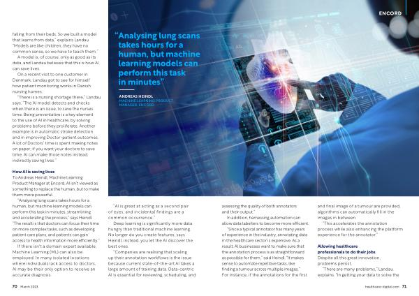 “ There is a nursing shortage there ,” Landau says . “ The AI model detects and checks when there is an issue , to save the nurses time . Being preventative is a key element to the use of AI in healthcare , by solving problems before they proliferate . Another example is in automatic stroke detection and in improving Doctor-patient outcomes . A lot of Doctors ’ time is spent making notes on paper ; if you want your doctors to save time , AI can make those notes instead , indirectly saving lives .”