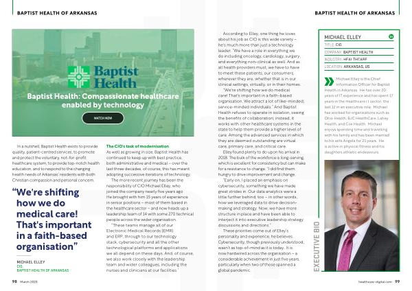Information Officer for Baptist Health in Arkansas . He has over 20 years of IT experience and has spent 17 years in the Healthcare IT sector , the last 12 in an executive role . Michael has worked for organisations such as Ohio Health , BJC HealthCare , Lahey Health , and Cox Health . Michael enjoys spending time and travelling with his family and has been married to his wife Angela for 21 years . He is active in physical fitness and his daughters athletic endeavours .