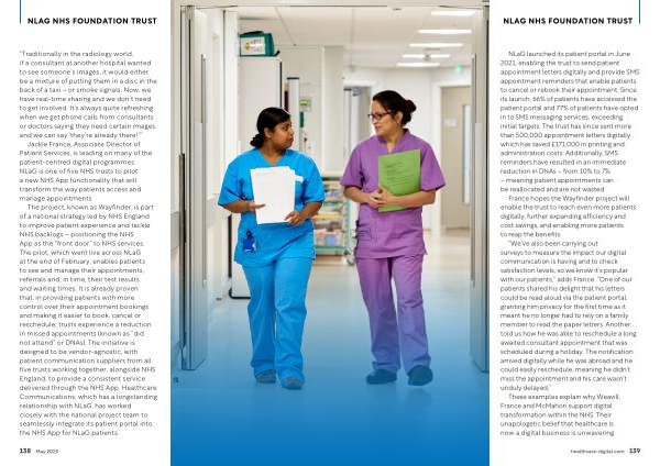 The project , known as Wayfinder , is part of a national strategy led by NHS England to improve patient experience and tackle NHS backlogs – positioning the NHS App as the “ front door ” to NHS services . The pilot , which went live across NLaG at the end of February , enables patients to see and manage their appointments , referrals and , in time , their test results and waiting times . It is already proven that , in providing patients with more control over their appointment bookings and making it easier to book , cancel or reschedule , trusts experience a reduction in missed appointments ( known as “ did not attend ” or DNAs ). The initiative is designed to be vendor-agnostic , with patient communication suppliers from all five trusts working together , alongside NHS England , to provide a consistent service delivered through the NHS App . Healthcare Communications , which has a longstanding relationship with NLaG , has worked closely with the national project team to seamlessly integrate its patient portal into the NHS App for NLaG patients .