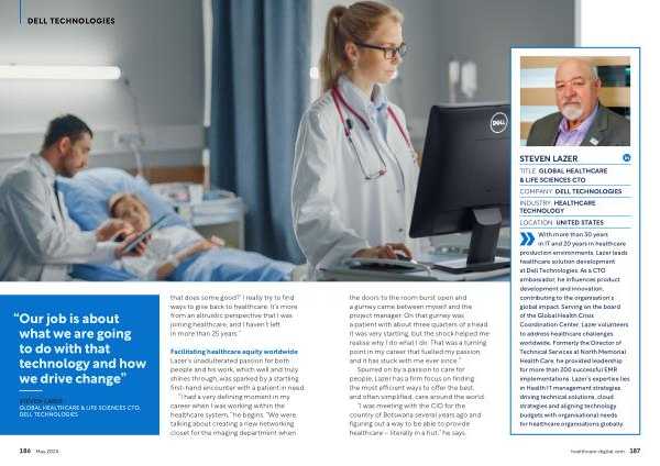 With more than 30 years in IT and 20 years in healthcare production environments , Lazer leads healthcare solution development at Dell Technologies . As a CTO ambassador , he influences product development and innovation , contributing to the organisation ’ s global impact . Serving on the board of the Global Health Crisis Coordination Center , Lazer volunteers to address healthcare challenges worldwide . Formerly the Director of Technical Services at North Memorial Health Care , he provided leadership for more than 200 successful EMR implementations . Lazer ’ s expertise lies in Health IT management strategies , driving technical solutions , cloud strategies and aligning technology budgets with organisational needs for healthcare organisations globally .