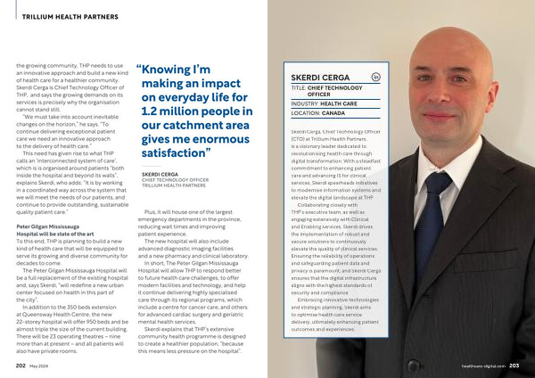 Skerdi Cerga , Chief Technology Officer ( CTO ) at Trillium Health Partners , is a visionary leader dedicated to revolutionising health care through digital transformation . With a steadfast commitment to enhancing patient care and advancing IS for clinical services , Skerdi spearheads initiatives to modernise information systems and elevate the digital landscape at THP .