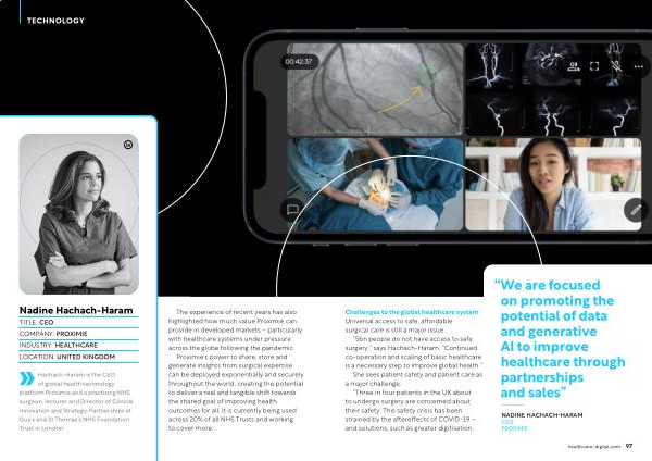 Hachach-Haram is the CEO of global health technology platform Proximie and a practising NHS surgeon , lecturer and Director of Clinical Innovation and Strategic Partnerships at Guy ’ s and St Thomas ’ s NHS Foundation Trust in London .