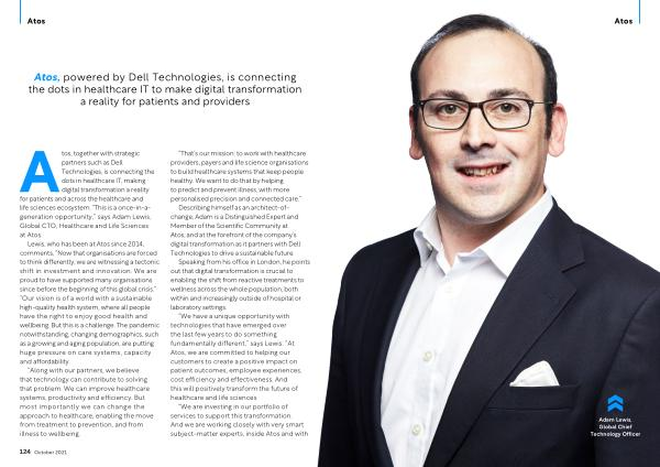 “ That ’ s our mission : to work with healthcare providers , payers and life science organisations to build healthcare systems that keep people healthy . We want to do that by helping to predict and prevent illness , with more personalised precision and connected care .” Describing himself as an architect-ofchange , Adam is a Distinguished Expert and Member of the Scientific Community at Atos , and at the forefront of the company ’ s digital transformation as it partners with Dell Technologies to drive a sustainable future .