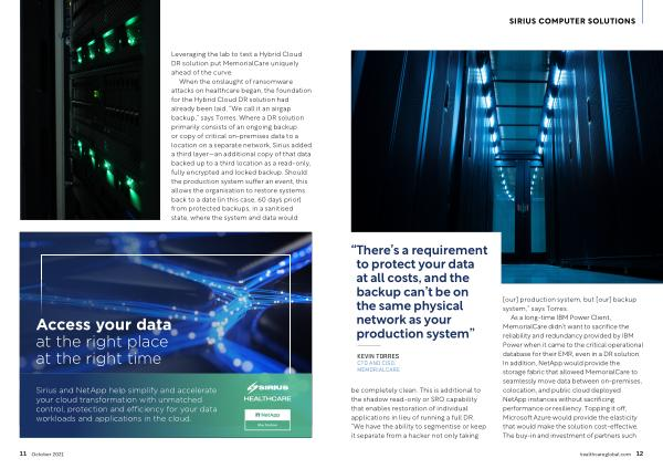 When the onslaught of ransomware attacks on healthcare began , the foundation for the Hybrid Cloud DR solution had already been laid . “ We call it an airgap backup ,” says Torres . Where a DR solution primarily consists of an ongoing backup or copy of critical on-premises data to a location on a separate network , Sirius added a third layer — an additional copy of that data backed up to a third location as a read-only , fully encrypted and locked backup . Should the production system suffer an event , this allows the organisation to restore systems back to a date ( in this case , 60 days prior ) from protected backups , in a sanitised state , where the system and data would