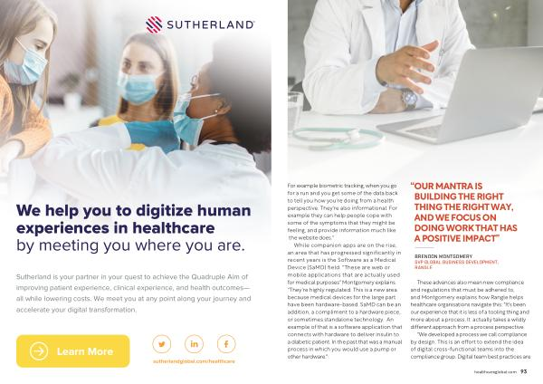 Sutherland is your partner in your quest to achieve the Quadruple Aim of improving patient experience , clinical experience , and health outcomes — all while lowering costs . We meet you at any point along your journey and accelerate your digital transformation .