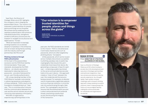 Sean Dyon , the Director of Strategic Alliances at HID , highlights the company ’ s role in shaping the passwordless future : “ Our mission is to empower trusted identities for people , places and things across the globe . We achieve this by enabling secure , seamless authentication that enhances individual productivity , strengthens workforce efficiency and ensures the freedom to navigate across physical and digital spaces ,” he says .