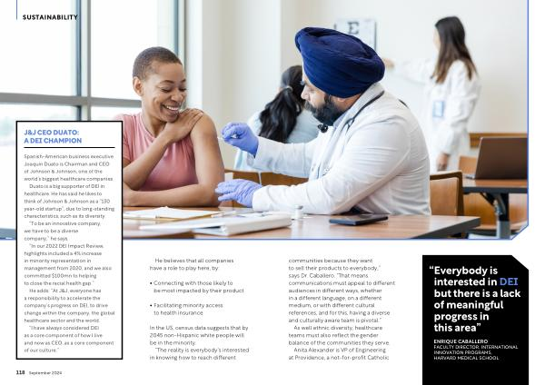 Duato is a big supporter of DEI in healthcare . He has said he likes to think of Johnson & Johnson as a “ 130 year-old startup ”, due to long-standing characteristics , such as its diversity .