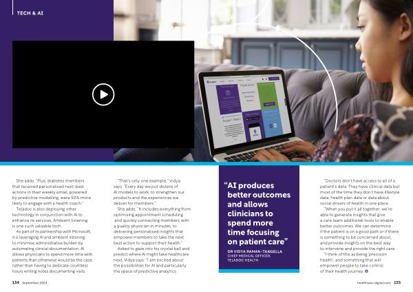 She adds : “ Plus , diabetes members that received personalised next-best actions in their weekly email , powered by predictive modelling , were 50 % more likely to engage with a health coach .” Teladoc is also deploying other technology in conjunction with AI to enhance its services . Ambient listening is one such valuable tech .