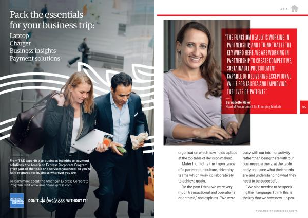 “ THE FUNCTION REALLY IS WORKING IN PARTNERSHIP , AND I THINK THAT IS THE KEY WORD HERE . WE ARE WORKING IN PARTNERSHIP TO CREATE COMPETITIVE , SUSTAINABLE PROCUREMENT CAPABLE OF DELIVERING EXCEPTIONAL VALUE FOR TAKEDA AND IMPROVING THE LIVES OF PATIENTS ”