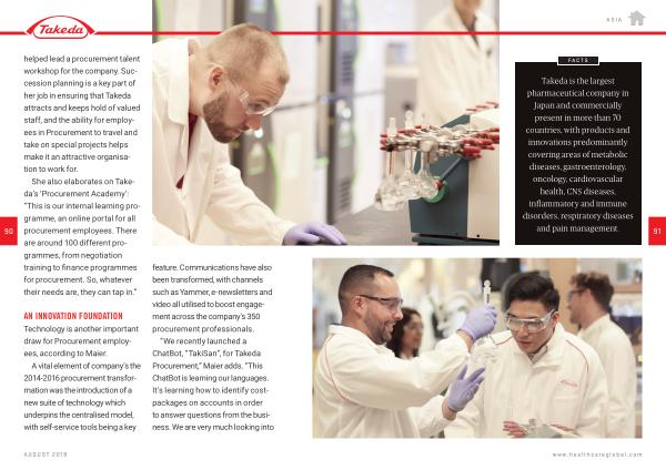 feature . Communications have also been transformed , with channels such as Yammer , e-newsletters and video all utilised to boost engagement across the company ’ s 350 procurement professionals . “ We recently launched a ChatBot , “ TakiSan ”, for Takeda Procurement ,” Maier adds . “ This ChatBot is learning our languages . It ' s learning how to identify costpackages on accounts in order to answer questions from the business . We are very much looking into