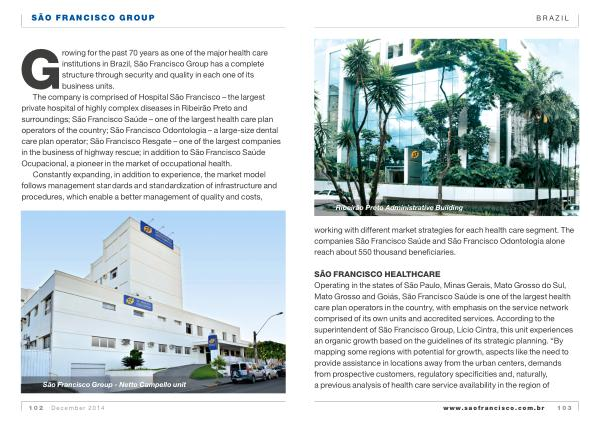 The company is comprised of Hospital São Francisco – the largest private hospital of highly complex diseases in Ribeirão Preto and surroundings ; São Francisco Saúde – one of the largest health care plan operators of the country ; São Francisco Odontologia – a large-size dental care plan operator ; São Francisco Resgate – one of the largest companies in the business of highway rescue ; in addition to São Francisco Saúde Ocupacional , a pioneer in the market of occupational health .