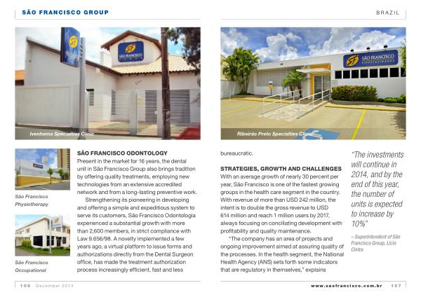 STRATEGIES , GROWTH AND CHALLENGES With an average growth of nearly 30 percent per year , São Francisco is one of the fastest growing groups in the health care segment in the country . With revenue of more than USD 242 million , the intent is to double the gross revenue to USD 614 million and reach 1 million users by 2017 , always focusing on conciliating development with profitability and quality maintenance .