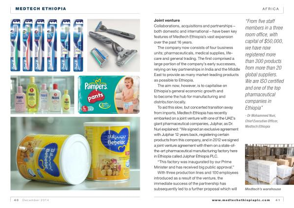 To aid this slow , but concerted transition away from imports , Medtech Ethiopia has recently embarked on a joint venture with one of the UAE ’ s giant pharmaceutical companies , Julphar , as Dr . Nuri explained : “ We signed an exclusive agreement with Julphar 12 years back , registering certain products from this company , and in 2012 we signed a joint venture agreement with them on a state-ofthe-art pharmaceutical manufacturing factory here in Ethiopia called Julphar Ethiopia PLC .