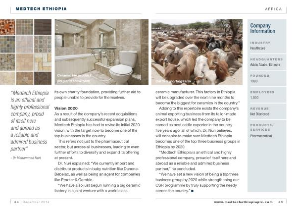 Adding to this repertoire exists the company ’ s animal exporting business from its tailor-made export house , which led the company to be named as best cattle exporter in the country five years ago ; all of which , Dr . Nuri believes , will conspire to make sure Medtech Ethiopia becomes one of the top three business groups in Ethiopia by 2020 .